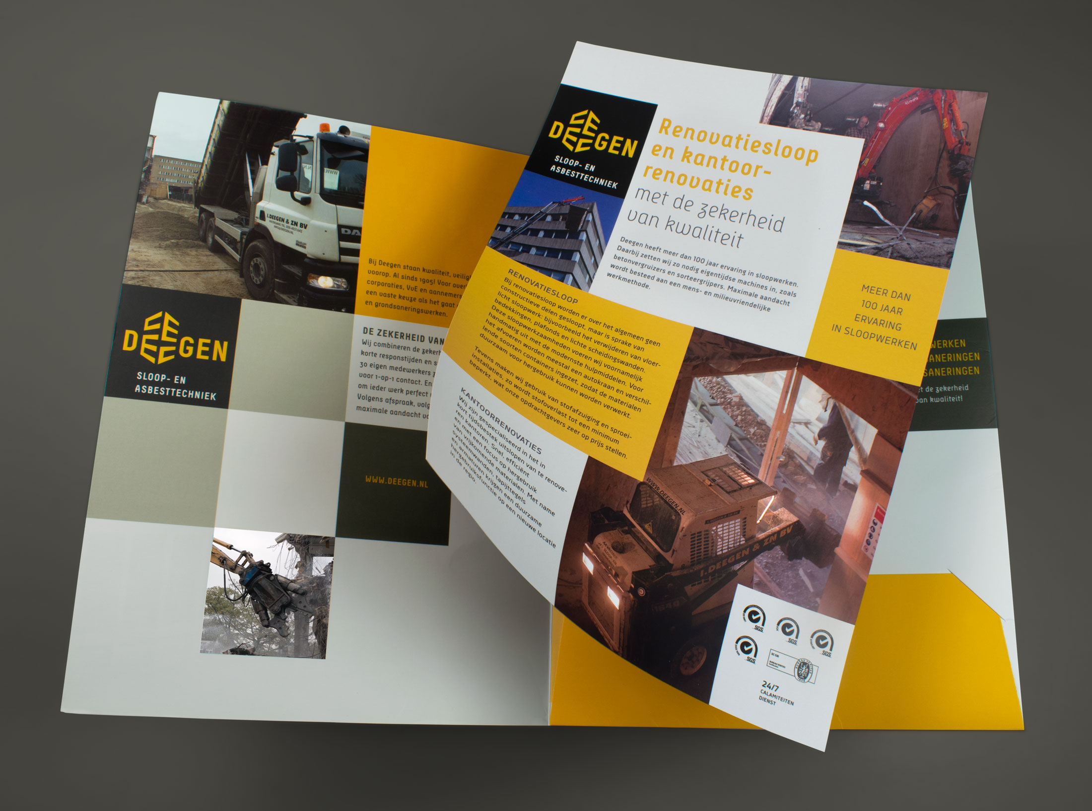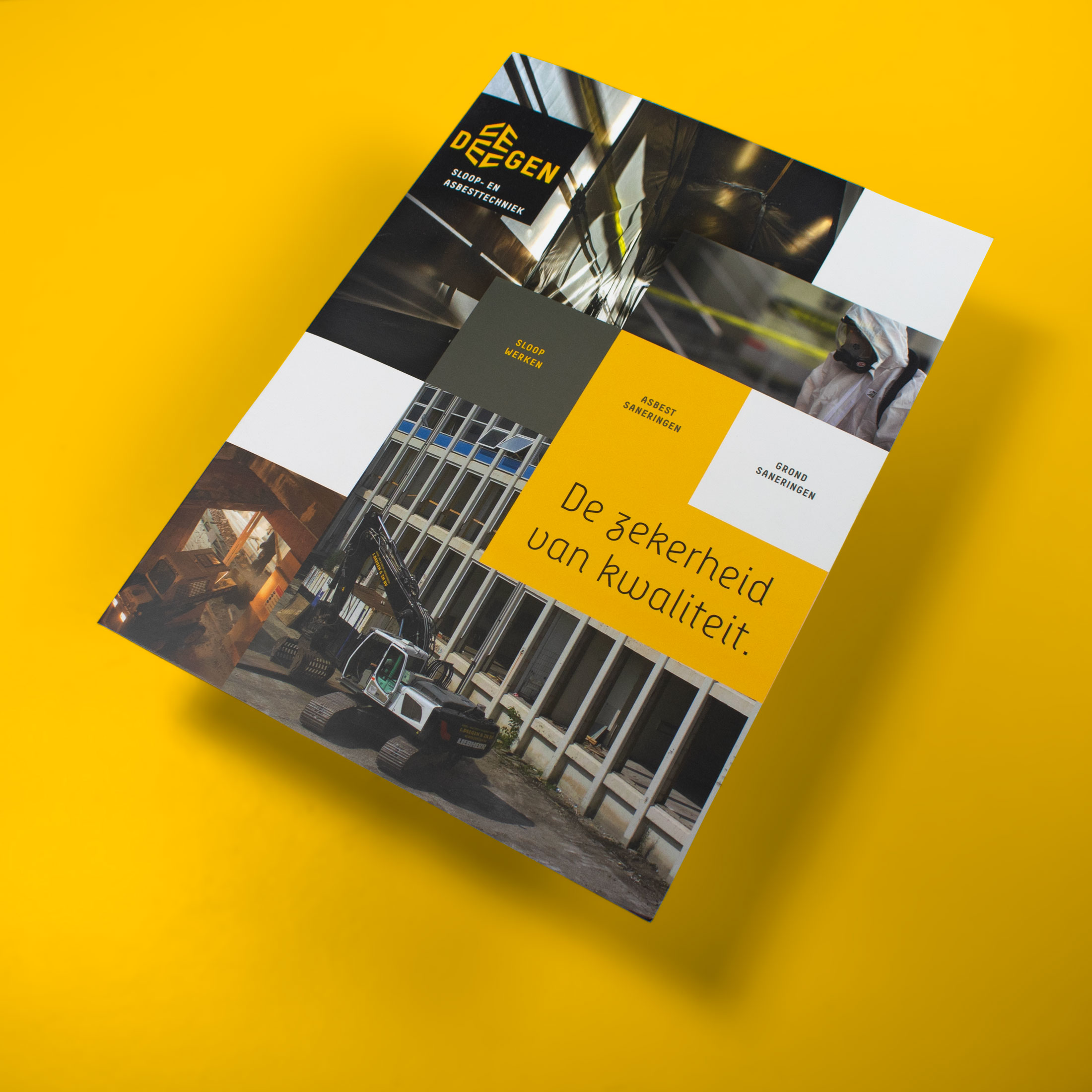 In samenwerking met Zwarthoed visuele communicatie ontwierpen wij de visuele identiteit van Deegen & Zoon bv, een familiebedrijf gespecialiseerd in sloop en in grond- en asbestsanering. Centraal in het logo staat een gebouw (gevormd door de letters E), in fase van deconstructie. De huisstijl wordt gekenmerkt door een ferm karakter waarmee de professionaliteit, daadkracht en betrouwbaarheid van Deegen tot uitdrukking komen.